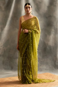 Featuring a luxurious silk organza sari embellished with shimmering Swarovski crystals, paired effortlessly with a textured lampi blouse — a statement ensemble that exudes elegance and modern glamour.