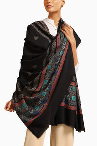 Kajal cashmere fine wool shawl offers a delightful blend of soft texture and vibrant multicolored designs, with an elegant touch on the border.