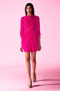 The luxurious and elegant draped mini dress fits like a total dream. Tailored to perfection in a self-printed fabric with a slight sheen the drapes fall in a way to perfectly accentuate your curves. A roped belt completes the look by cinching the waist. Pair this dress with elegant heels for a complete look.