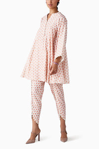 Elevate your ethnic wardrobe with Kalina Ivory Multicolored Print Flared Short Kurta and Tulip Pants set. Crafted from premium Chanderi fabric, this 2-piece ensemble features an ivory kurta adorned with a captivating multicolored boota print, paired with matching tulip pants. Embrace elegance with a touch of vibrant charm.