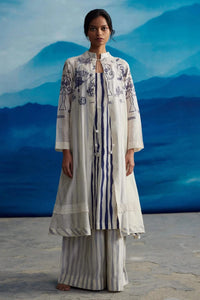 Introducing a chanderi overlay, designed for comfort and a relaxed fit, ideal for effortless elegance in any setting. Pair it with our 4 pleated pant, a boyfriend-style creation featuring front pleats, convenient side pockets, and a generously wide leg. Together, they create a chic and versatile ensemble that combines contemporary style with ease of wear.