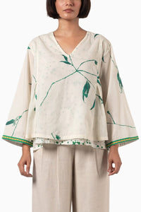 Featuring Kallie Green Top from Shades of India by Cinnamon Collection. This top captivates with an abstract leaf design on natural voile. Hand-woven checks on the cuffs and a contrasting splash-print lining hint at its intricate artistry.