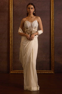 Featuring Kamya Ivory Gold Ombre Dabka Zardozi Pre-Stitched Saree by The House of Exotique's Nagma Collection. The fully embellished Dabka Zardozi corset blouse features a V-neck, padding, and a center back zipper fastening with an inside elastic band for extra tightening. The pre-draped crinkle chiffon saree is designed with a classic standard drape, scalloped lace borders, delicate embroidery, and tassels and feathers at the pallu, with an attached petticoat. Crafted from raw silk and crinkle chiffon in a stunning ivory and gold ombre.
