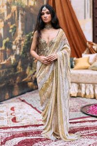 This is a pre-draped saree in silver, Green, gold tissue stripes. It has a mirror lace detailing. The saree is paired with a mirror lace fringe corset.