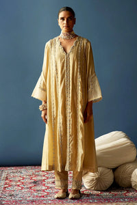 The Kanari Topaz Kaftan is a contemporary take on the kurta silhouette with flared sleeves, crafted in pure silk. The front and back of the kaftan is decorated with linear stripes in museim quality heritage hand embroidery in dabka and pearls while the sleeves feature a Mughal arch inspired border in similar hand embroidery. The kaftan is paired with a matching Kanari Topaz Pyjama decorated with a hand embroidered border to match.
