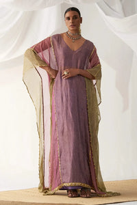 Featuring Kand Pushp Purple Kaftaan by ITRH's Sona Chandi Collection, this color-blocked kaftan is intricately detailed with ghunghroo accents and vertical gota stripes. Its contemporary design and luxurious details make it a stunning and versatile piece for any occasion.