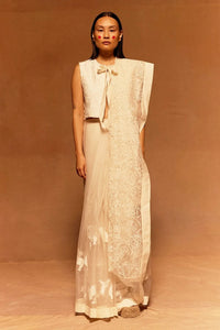 The Kanpeki Organza Saree is a stunning half-and-halfdesign, featuring delicate appliquand intricateembroidery. The sheer, lightweight fabric drapeseffortlessly, creating a graceful, fluid silhouette. Withits refined details and timeless appeal, this saree is an