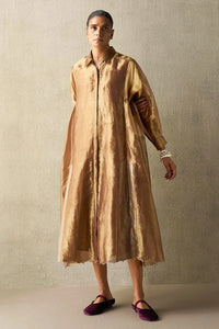 The Karam Gold Tissue Dress is tailored in the finest handwoven tissue in silk and gold plated zari. The side panels of the dress feature gathers and a contrasting panel of silver handwoven tissue inspired by Mughal arches. The hemline of the dress is delicately finished with our signature handcut scallops inspired by Mughal arches.