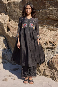 The Karen Black Dress is a timeless button-down style, adorned with exquisite hand-embroidered borders on the waist and sleeves, offering a perfect blend of elegance and comfort. Paired with the Carly Pull-On Trousers, featuring convenient pockets and a delicate scalloped hem, this set combines sophistication and practicality for a chic, effortless look.