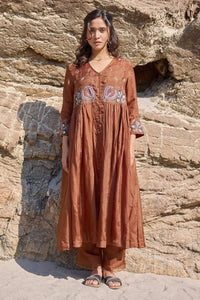 The Karen Brown Dress is a classic button-down style featuring exquisite hand-embroidered borders on the waist and sleeves. With its refined detailing and timeless silhouette, this dress offers a perfect mix of elegance and versatility for any occasion.