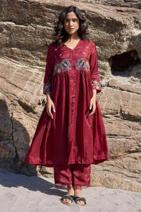 The Karen Maroon Dress is a classic button-down style featuring exquisite hand-embroidered borders on the waist and sleeves. With its refined detailing and timeless silhouette, this dress offers a perfect mix of elegance and versatility for any occasion.