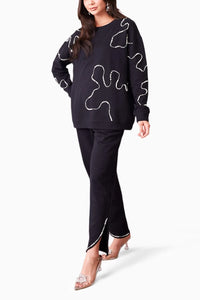 Layer up in the luxury and style of our black fleece co-ord set with delicate pearl detailing on the top and pant hemline.