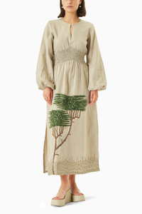Nothing says 'Welcome to Africa' quite like the flat-topped Acacia Tree. It's the quintessential symbol of the African wild. Our Karibu Dress welcomes you to this beautilful landscape with its very own hand- embroidered acacia trees. Just as the tree always stands out, basking alone in the jungle, so will the wearer in this lovely linen dress.