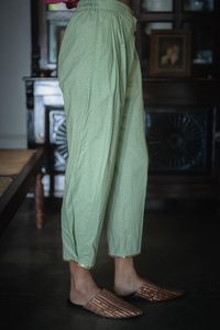 Featuring Kasbi Green Keerat Pant by Swatti Kapoor from their Faridkoot Collection. These 100% cotton cambric pants are enhanced with hand block-printed foil and feature an inverted pleat at the hem, elegantly embellished with detailed hand embroidery. The combination of traditional techniques and modern design creates a chic and refined look.