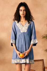 Featuring Kashmir Vogue Chambray Dress from Hargulbano's GuleBahar Collection, this cotton chambray dress blends everyday ease with elevated charm. Fully lined and flowing in a serene chambray hue, it’s designed for graceful movement and effortless sophistication.