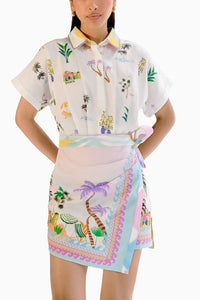 Introducing the Kate Mini featuring a tie belt at the waist, accentuated with an elasticated back for a custom, comfortable fit. Embroidery detailing on the collar adds an elegant touch, while the placement prints—By the Sea and Postcard—evoke serene moments of collecting seashells by the shore or reminiscing through treasured memories.