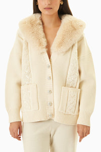 With a loose fit , this sumptuously soft ca rdiga n is ma de in our signa ture soft wool a nd ca shmere blend . The Ka te ca rdiga n ha s the most bea utiful sequin ca ble knit deta iling a nd a deta cha ble fa ux fur colla r - dressing you up for every occa sion !