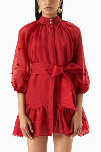 Red organza dress with ruffled hem, waist-cinching belt, and puff sleeves.
