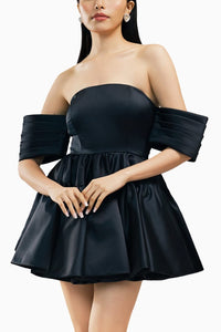 Featuring Kathrine Pleated Off Shoulder Sleeves Dress by Brinda Sneha by their Love Locked Collection. It's a fit and flare mini dress crafted with pleated off-shoulder sleeves that add a touch of drama and style and a gathered two-paneled skirt that creates a graceful and flattering silhouette, enhancing the overall charm of the dress. Perfect for evening events or special occasions like proms and birthdays, this dress combines classic design with contemporary elements for a timeless look.