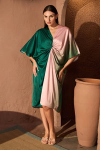 Flaunt your vibe and elegance in this stylish Kathyrn Kaftan Dress. Crafted in a printed satin fabric, highlighted by beautiful embroidery on the neck. The color combination exudes elegance and sophistication with utmost comfort due to the buttery fabric. Elevate the look for your next beach/resort outing with the transparent heels/ flats and statement earrings!
