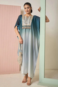 Flaunt your vibe and elegance in this stylish Kathyrn Kaftan Dress. Crafted in a printed satin fabric, highlighted by beautiful embroidery on the neck. The color combination exudes elegance and sophistication with utmost comfort due to the buttery fabric. Elevate the look for your next beach/resort outing with the transparent heels/ flats and statement earrings.