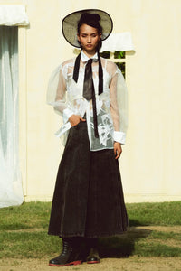 Elevate your style with the Katy Black and White Co-ord Set. This unique ensemble features a white embroidered organza shirt paired with an acid-washed denim skirt, blending elegance and edge for a standout look.