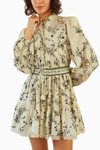 Featuring the Katya Short Dress from Roseroom's Spring 2024 Collection. This elegant piece boasts a flowery ivory print on soft cotton slub fabric. Adorned with delicate lace insertion and a chic tie-up neck, it exudes timeless charm in white and ivory.