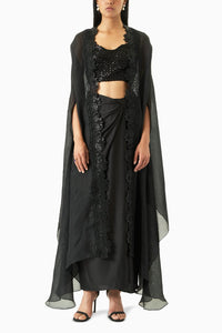Black scallop-laced organza signature cape paired with embellished katdana blouse and signature drape skirt.