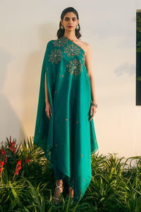 Featuring Keli Co-ord Set by Shikha Mehta from Baagh Collection. This emerald silk chanderi tunic showcases one-shoulder design with elegant thread embroidery and a loose fit. It pairs flawlessly with matching silk chanderi cigarette pants, creating a chic and contemporary silhouette.