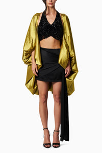 The Kelly Cape is a timeless piece that can be worn over a crop top or a shirt. It features balloon sleeves with a gathered hem for a dramatic touch. Designed to frame the body, it pairs perfectly with a top or ganji and jeans.