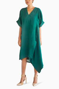 Featuring elegant and comfortable Kerchief dress in Juniper Green. The dress has a V neck and relaxed half sleeves with top stitch detailing. The scarf end has button closure for the comfort of the wearer and is lined with our Marble print in White and Nude to add the extra finish to the fluidity of this beautiful dress.