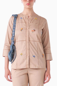 Featuring a Cotton Satin Fernoa khakhi embroidered shirt designed in a regular fit. It showcases delicate floral hand embroidery on the front, enhanced with block panel bidding details and tonal buttons for a refined, handcrafted finish.
