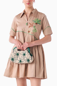 Featuring a Cotton Satin Samui khakhi embroidered tiered dress, accented with green piping details. This elegant piece includes a front zipper adorned with a charming bird tassel, blending intricate craftsmanship with subtle statement touches.