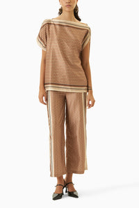 Geometric printed top in shades of beige and khaki with contrasting placed borders outlining the top. Kaftan style details and be worn two ways - as one shoulder scarf top or off shoulder. Paired with matching straight pants. Semi-elasticated at the waist.