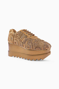 Our Khazana wedge sneakers are truly a treasure. They are crafted from luxurious satin and adorned with zardozi work on a bold wedge-sneaker silhouette. Why a wedge and a sneaker? Anaar’s philosophy of comfort without compromise led us to innovate on this silhouette, ensuring you stay stylish, but for longer.