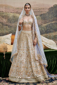 Powder blue organza lehenga with mirror work embroidery and gota detailed border, paired with a organza blouse and dupatta , the blouse has mirror tassels attached to the cap sleeves in addition to dupatta the lehenga has a veil to complete the look.