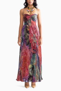 Featuring Kiara Multi Dress by Saaksha & Kinni from Botanica Collection. This daisy print hand micro pleat maxi dress adorns delicate noodle straps and a flowing, pleated silhouette.
