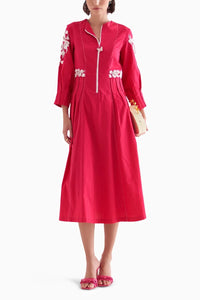 This embroidered cotton midi dress features delicate waist and sleeve embroidery, complemented by a front white zipper and waist pleat details. With a calf-length silhouette, side pockets, and a flattering fit-and-flared design, it combines style and comfort effortlessly.