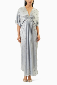 Featuring Kim Cloud Grey Kaftan Dress by Kangana Trehans's Rush Hour Collection. Breathable and breathtaking at the same time, this satin-silk kaftan dress is every bit flattering. The intricate embellished details make it the perfect ensemble for a transitional look.