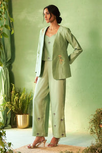 A contemporary three-piece ensemble featuring an embroidered camisole with delicate all-over palm tree motifs. Paired with wide-legged pants adorned with matching embroidery at the hem for a cohesive look. The full-sleeve Chanderi jacket adds a refined touch with its subtle motif on one panel. A perfect blend of comfort, elegance, and modern versatility.