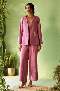 Embrace modern elegance with this three-piece coord set featuring a delicately embroidered camisole adorned with all-over palm tree motifs. It’s paired with wide-legged pants showcasing matching embroidery at the hem. A full-sleeve Chanderi jacket with a subtle motif on one panel adds refined versatility. Designed for comfort and contemporary charm, this ensemble transitions effortlessly from day to evening.