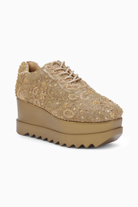 Inspired by the centuries-old Japanese art, our Kintsugi wedge sneakers are artistically gilded. Each pair is put together like an artefact at Anaar’s atelier. What goes into constructing this wearable art piece? Aari embroidery, zardozi work, crystals, sequins, mini pearls, and diamonds. It’s designed to steal the show by showcasing handicrafts and signature silhouettes.