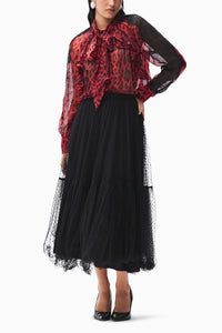 The Kira Red Leopard Printed Co-ord Set features a striking red leopard print shirt paired with a playful swiss dot net skirt. This bold and stylish ensemble offers a unique, trendy look, perfect for standing out at any casual or semi-formal event.