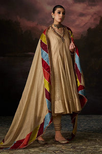 Featuring Kiran Gold With Multicolor Border Dupatta by Swatti Kapoor’s Firdaus collection. A handwoven 40gm Chanderi dupatta with 60gm Chanderi spliced border, adorned with Kiran lace and elegant gota lines, offering timeless craftsmanship and festive flair.