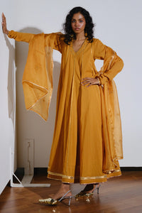 Featuring the Kiran Gown in rich mustard cotton mul fabric. It has bijiya gota detailing along the neckline, sleeves, and hem, with a fluid silhouette for festive elegance. Paired with a Kota doria silk dupatta, this fully lined gown is handcrafted in India, perfect for day or evening wear.