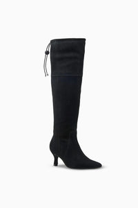 These black suede long boots feature a stylish kitten heel and extend above the knee for added sophistication. With a customizable fit, the adjustable string at the back ensures a perfect, tailored look. A chic and versatile addition to any wardrobe.