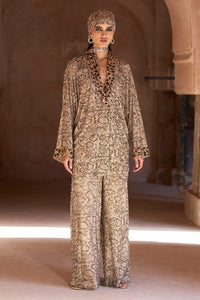 Crystal-embellished gold snake print tunic and pants, featuring a stone-embellished embroidered yoke and cuffs along with a matching headgear accessory.