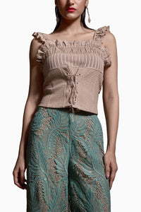 Corset-inspired knit top in dusty brown. Features paneling of textured knit fabrics and cotton cutout laces. Lace tie-up front and anglaise lace on the shoulders and bustier.