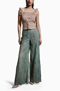Corset-inspired knit top in dusty brown. Features paneling of textured knit fabrics and cotton cutout laces. Lace tie-up front and anglaise lace on the shoulders and bustier. Paired with Seafoam cutwork lace pants with sequin appliqué. Allover leaf pattern with full nude lining. Flared hem, elasticated waistband, and side seam zipper.