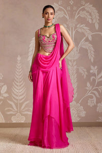 Featuring Knot Bright Fuchsia Embroidered Back Tie Sari Set by Ridhi Mehra's In the Folds Summer Collection '25. This bold set includes a net embroidered back tie-up blouse, paired with a chiffon double draped saree, creating a stunning contrast of intricate details and flowing elegance. The bright fuchsia hue adds a vibrant, dynamic touch.